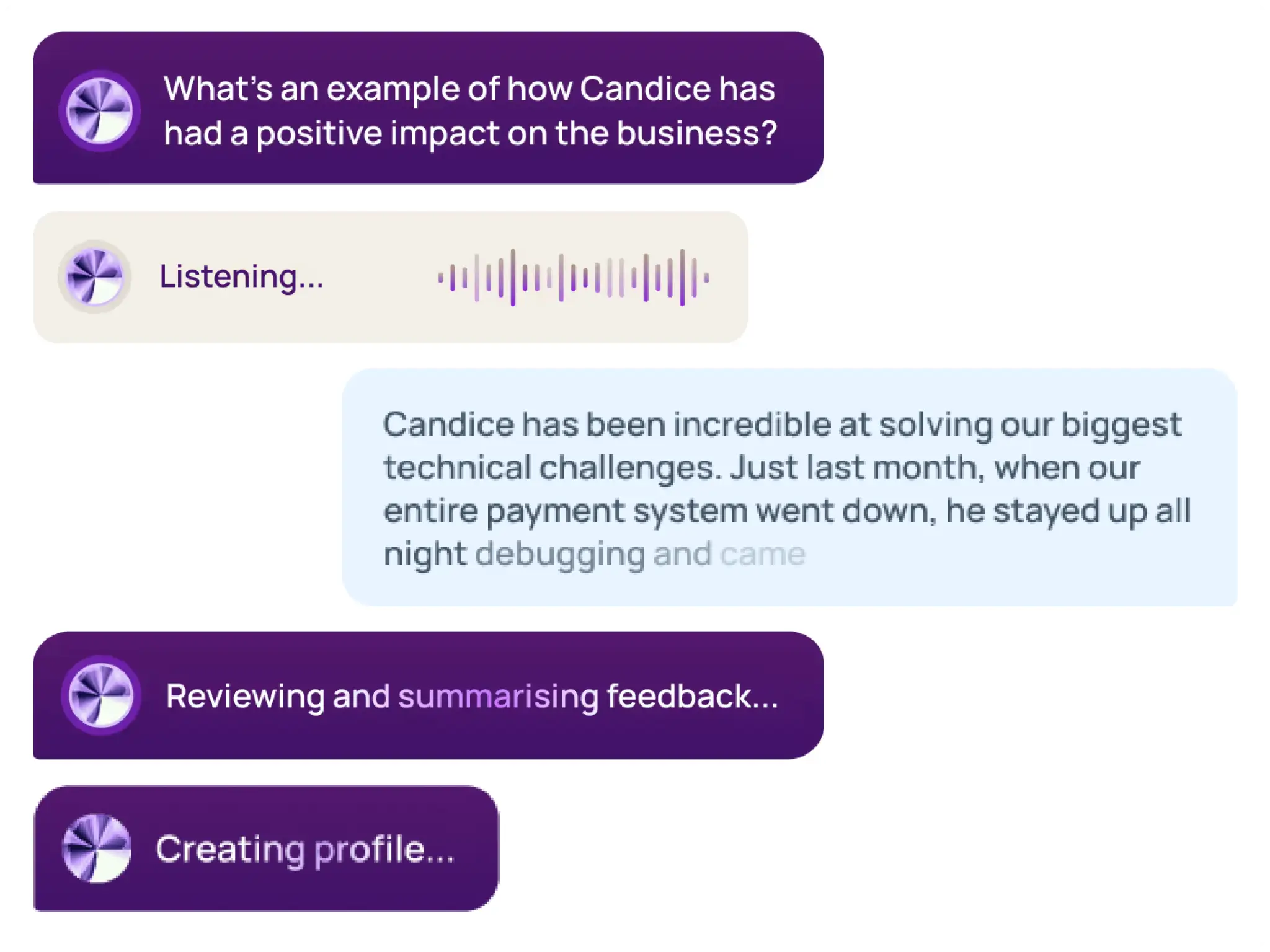 AI powers every step of the Huckleberry experience. It guides voice conversations to gather rich feedback, transcribes and analyzes responses for themes and sentiment, synthesizes insights across multiple perspectives, and generates personalized growth plans. All while maintaining privacy and removing bias.
