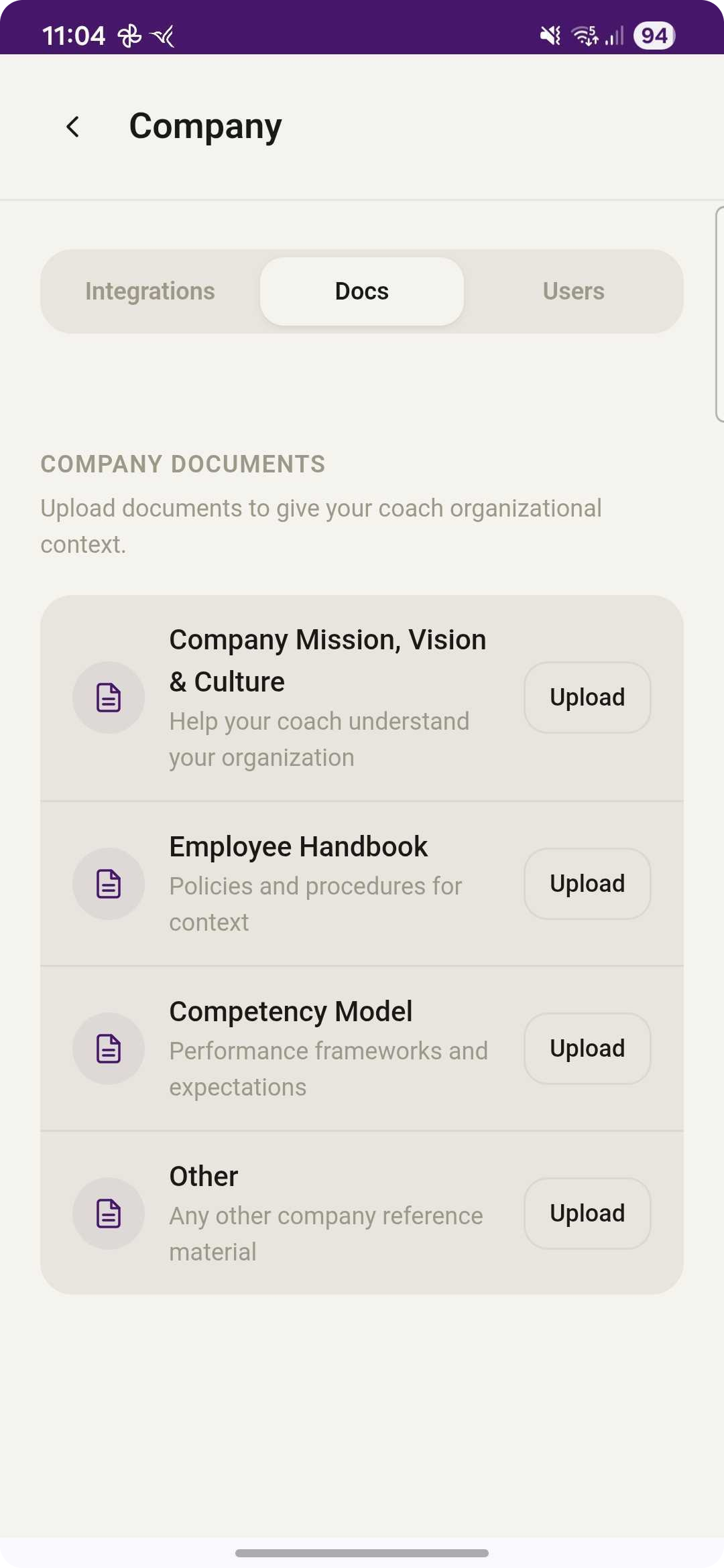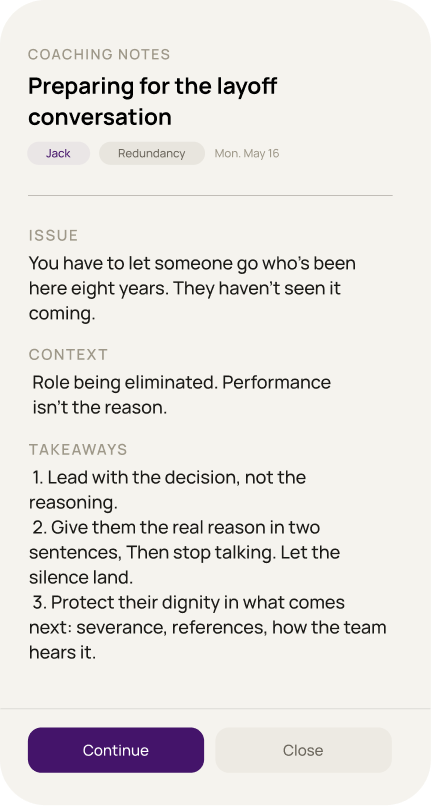 Connect your HRIS. Org charts, team structures, and reporting lines load automatically. The coach understands who works with whom.